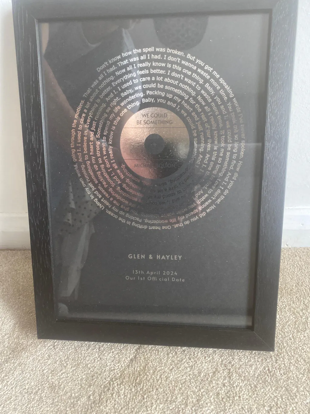 Great idea, fantastic art work , fantastic customer service and my partner actually CRIED when she opened the gift and read the lyrics to a song I dedicated to her!! Thank you so much guys x Glen and Hayley